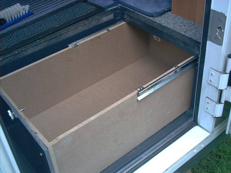 Ich habe mir eine Schublade gebaut 20 x 30 x 60 (HBT) die an einem Kugelauszug hängt und voll ausgezogen werden kann.